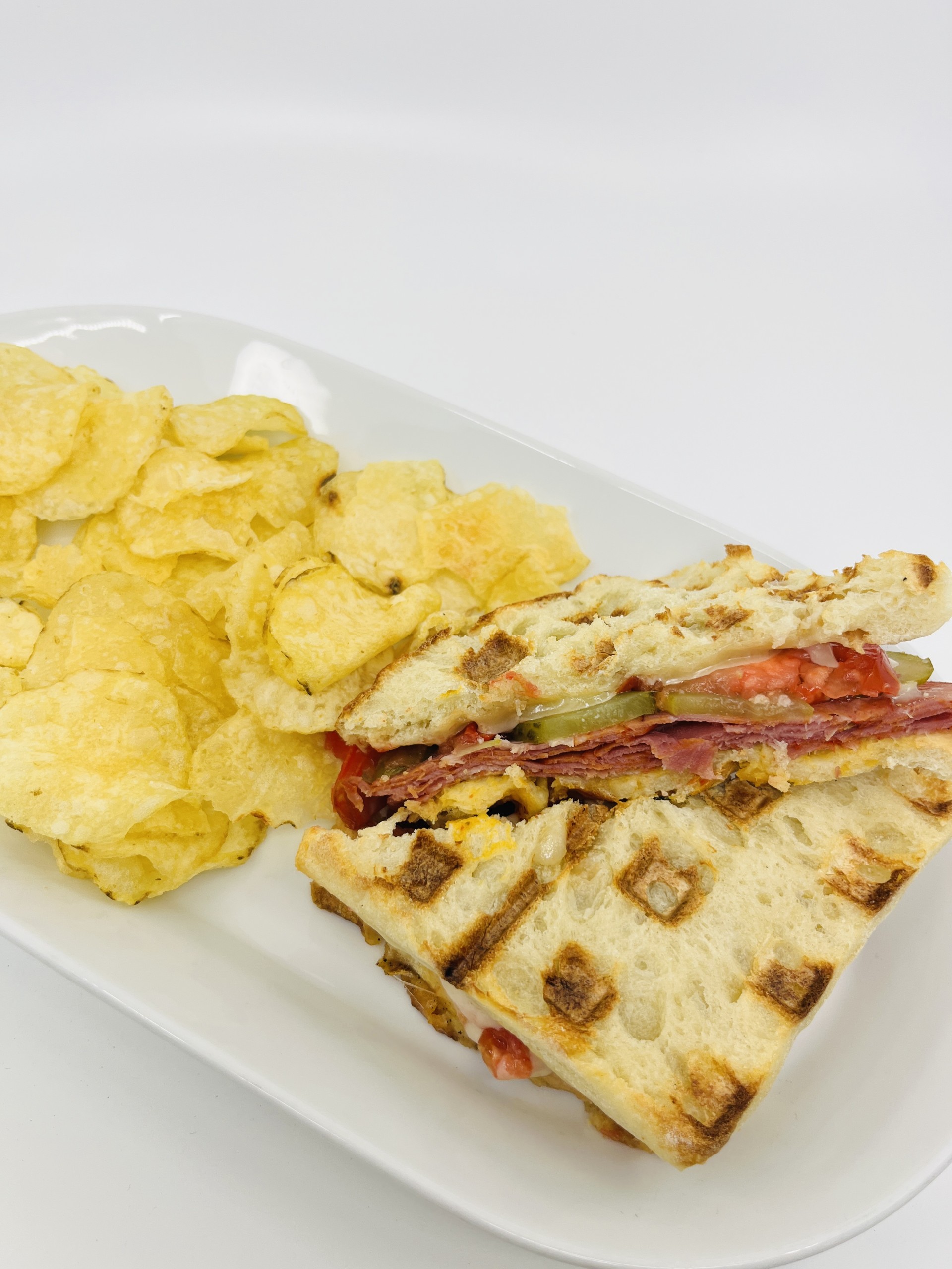 Turn up the heat with our Spicy Italian Salami Panini. Layers of spicy salami are paired with provolone cheese and fresh tomato slices, European pickle slices all brought together with a creamy Southwest hot mustard . Grilled to a perfect crunch, this sandwich is both hearty and fiery, ideal for those who love a bit of spice in their meal served with Kettle chips.